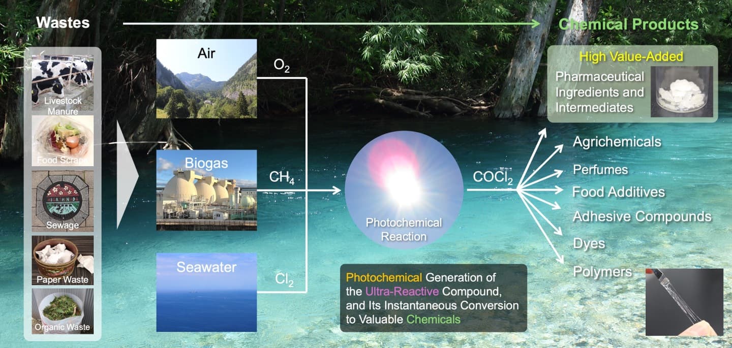 After about 15 years of study, the Tsuda Laboratory at Kobe University succeeded for the first time in the world in photo-on-demand synthesis of valuable chemicals from chlorocarbons and methane. To date, we have obtained about 40 domestic and international patents, and have established Photo-on-Demand Chemical Co., Ltd. We will conduct further research and development for industrial use of the chemical reaction and develop an unprecedented eco-chemical production business using sewage, seawater, and air as raw materials. We aim to contribute to society through both in-house production and joint production